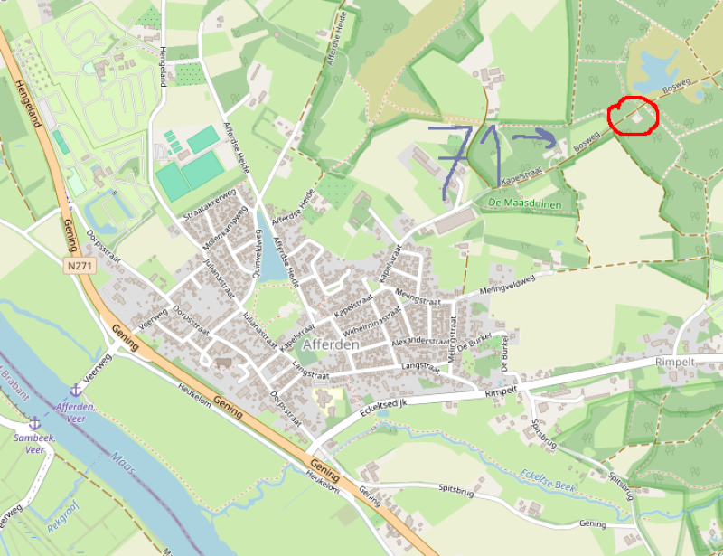 De parkeerplaats (rood omcirkeld) ligt aan de Bosweg (het vervolg van de Kapelstraat) op ongeveer 500 meter na De Zevenboom, Kapelstraat nummer 71, (blauwe tekst op de kaart), 5851AS Afferden.